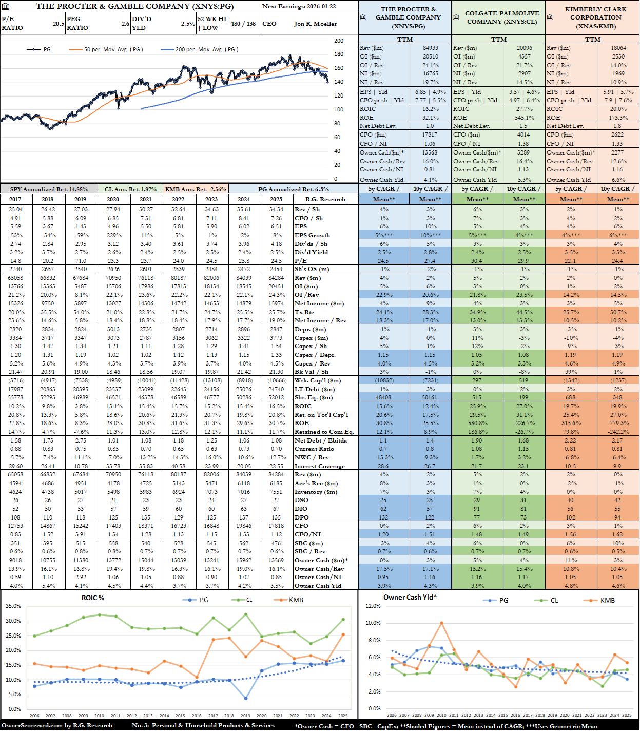 No. 3 - Procter & Gamble, Colgate-Palmolive & Kimberly-ClarkFinancial history of 3 household & personal care businesses. R.G. ResearchDec 11, 2025ShareDownload PDF for full 3-page owner scorecard report.Owner Scorecard 3667KB ∙ PDF fileDownloadDownloadPG Filings CL Filings KMB FilingsAn enormously efficient way to garner information about various businesses.Subscribe